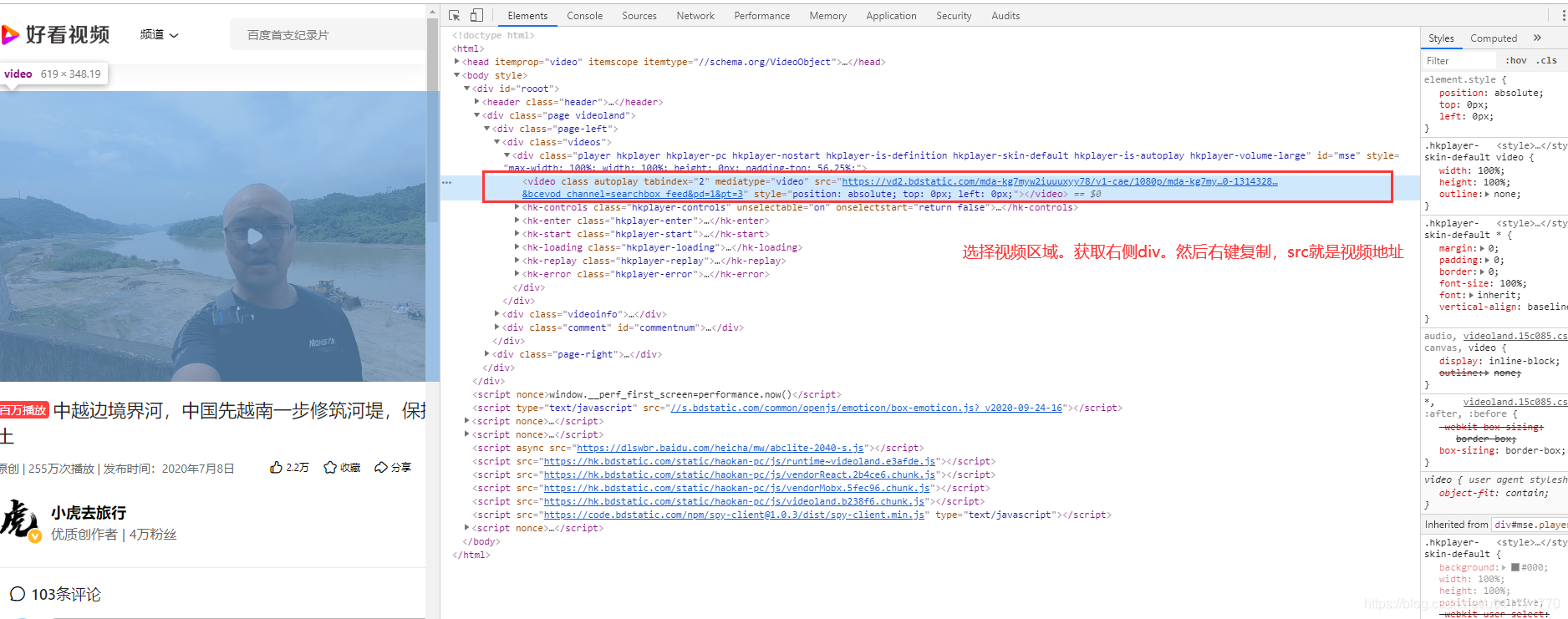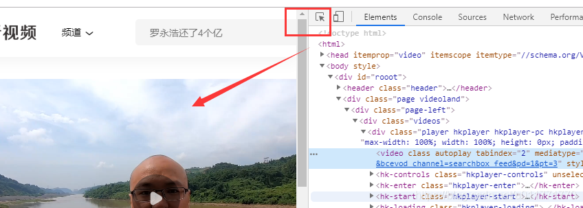 2、鼠标选择如图的箭头。然后点击左侧视频区域,然后右侧打开了html结构。